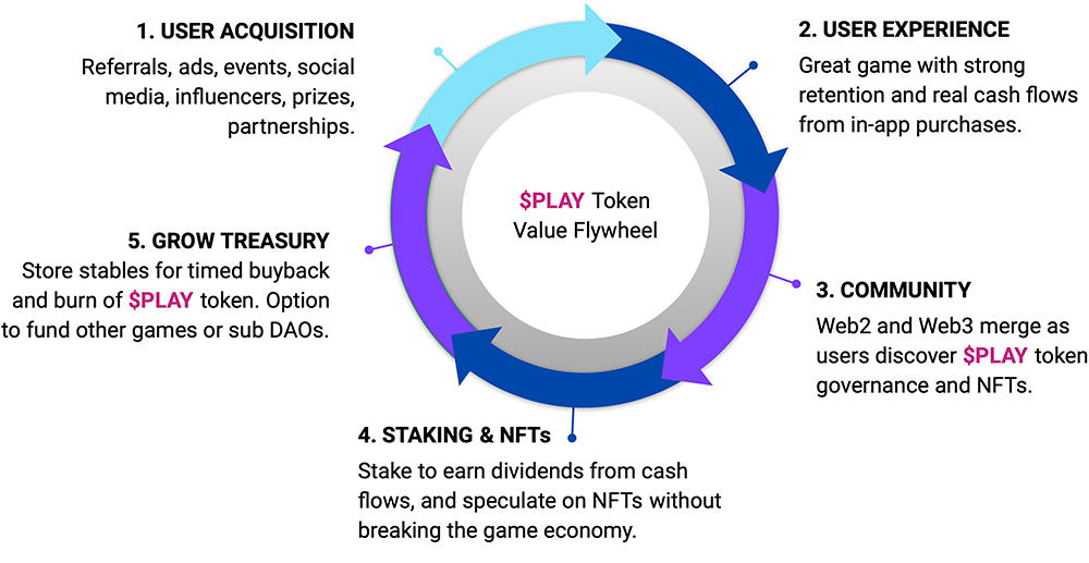 Players receive $PLAY, the hard capped token for our platform, simply by engaging with the app. $PLAY is primarily a governance token that aligns investor and player goals: raising the token price while keeping the game fun.